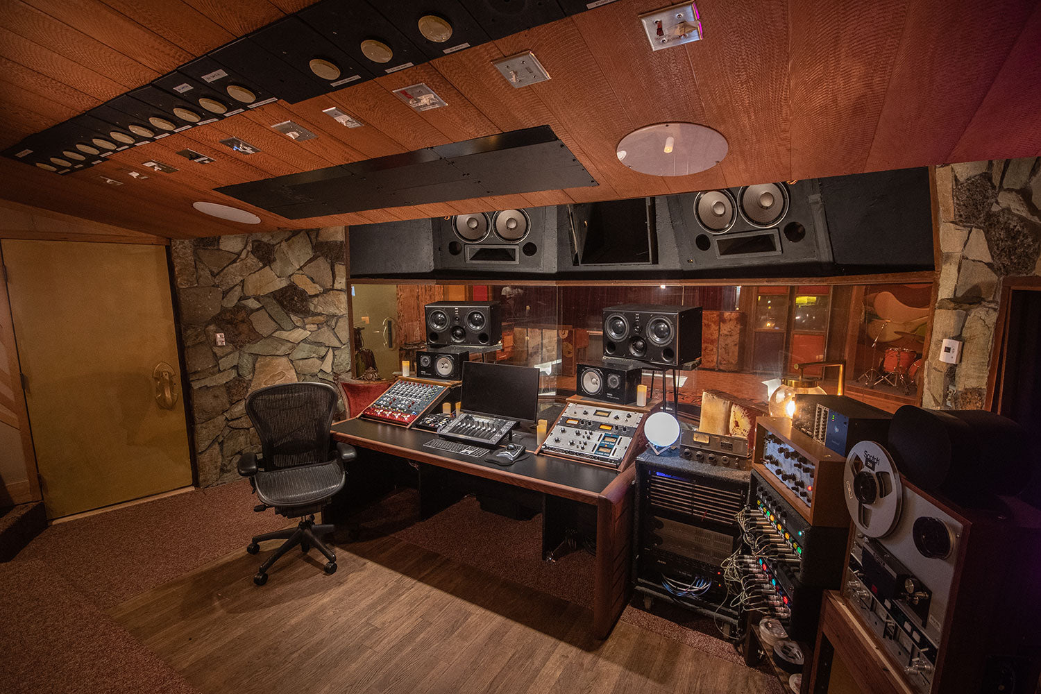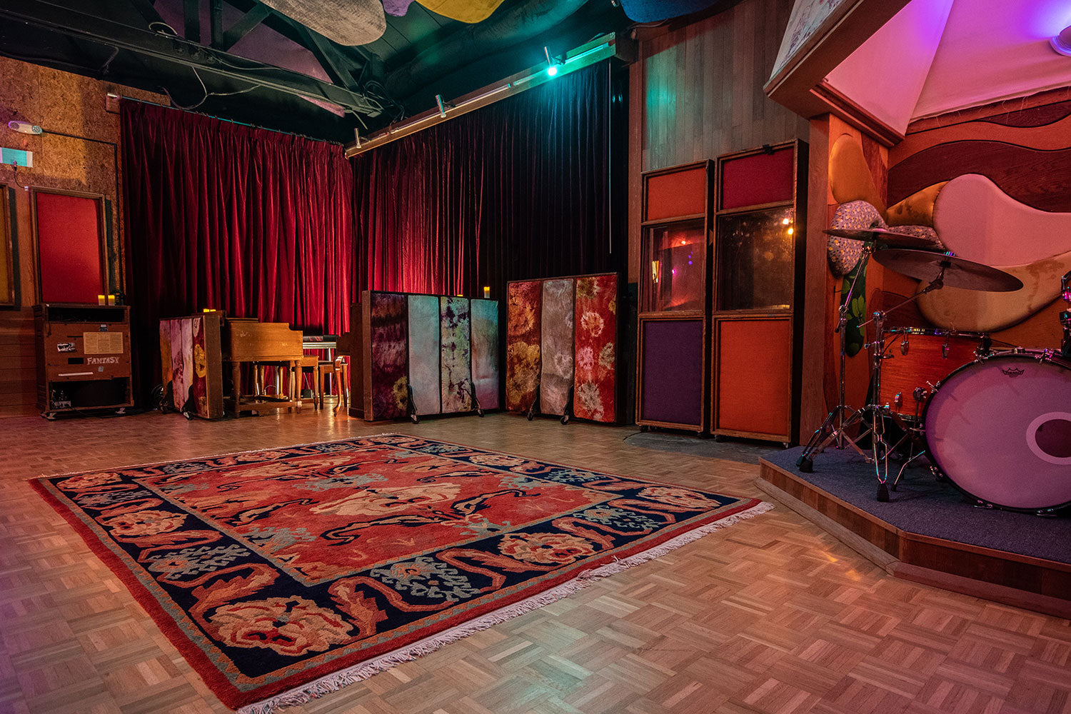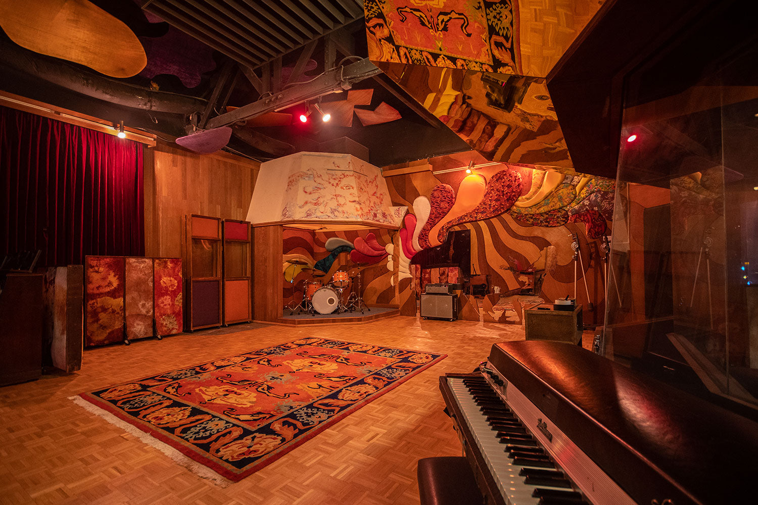 Studio B is instantly recognizable by its vibrant, multi-colored fabric swirls adorning the walls. The mirrors, curtains, and uniquely shaped acoustic baffles remain unchanged, transporting you back to 1972. The live room retains its classic dry acoustic properties that defined the sound of so many beloved records from Fleetwood Mac’s “Rumors” to Stevie Wonder’s “Songs In The Key Of Life”. Notably, the "drumbrella" in the corner produces the beautifully dry, thuddy drum tone heard on countless hit records. Designed by the renowned Gary Kellgren and Tom Hidley, Studio B is a space that musicians consistently describe as "magic." Its perfectly dry, compressed acoustics elevate the sound of any instrument played in the live room while adding a controlled ambience to live ensembles. Studio B is equipped with a vintage Hammond B3 organ and an upright piano. It also includes a medium-sized iso booth ideal for vocals, acoustic instruments, or guitar. However, once you experience the live room's unparalleled sound, you'll want to track as much as possible there.